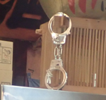 ![]() 縁起物の達磨に手錠が かけられていた。 |