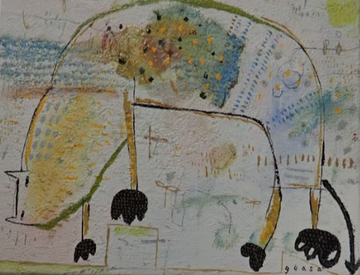 | 下は4点で作品になるように飾ることを考え買った。上が2006年、下が2005年の春陽会のチャリティ用のドローイング。画家は毎日小さなスケッチ帳に日記でもつけるように描いている。何か描いている。何十年も続けている。 その中で、時折色紙のような作品が生まれている。この4点は布に描かれている。 優しさと孤独から助けを求める声が聞こえる。いや、私を助けてくれて励ましてくれているのかもしれない。 勝手にヒーローみたいに助けなきゃと思う自分をいましめてもいるようだ。4点合わせての題名は、まだ無い。 | |