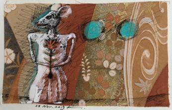 | 最後の年男かもしれないと思い購入した。画家は私と同年配である。戦後団塊の世代を生き抜いた男の生き様の終焉を迎える姿を投影している気がした。自分に同化している気もした。左は蝶を追う鼠(私)を自分自身が客観的に見つめている。他者が入る余地はない。右は構図が一目で気に入った。屈原を思わせる余白が何とも私らしい人生と重なり合っていると感じた。最初のモノクロのカットの時は半分だけでもの足りなかったが、やはりタブローは異なっていた。金泥があり華やかであり、そこは自分にない部分である。最後は派手目にと言うことか。 | |
