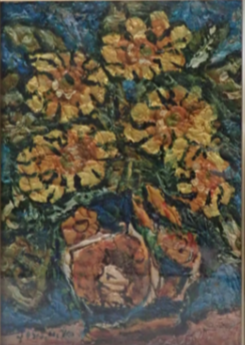 菱刈俊作 ![]() 新聞紙などモノクロ写真などを小さく割き貼り絵風で、顔の造作がない作品しかないと思い込んでいた。偶然小品だが、目鼻口らしき表情が見られ手に入れた。 |