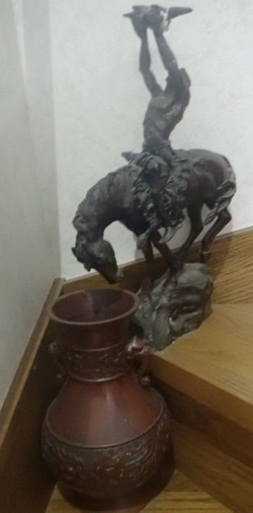 勝利の雄叫び(ブロンズ)と仮題をつけていたが、作家は不詳、下の銅製の壺とセットにして、階段の脇に置いてある。 |
