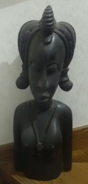 買ったときは《アフリカ婦人像》だ。上の作品の反対側の階段の脇に置いている。観ると和む。毎日なんとなく見ては昇り降りしている。 仮題とはいえ、木彫の色合いが黒いのと人的特徴からつけたと思うが、私は単に半身像としている。 |