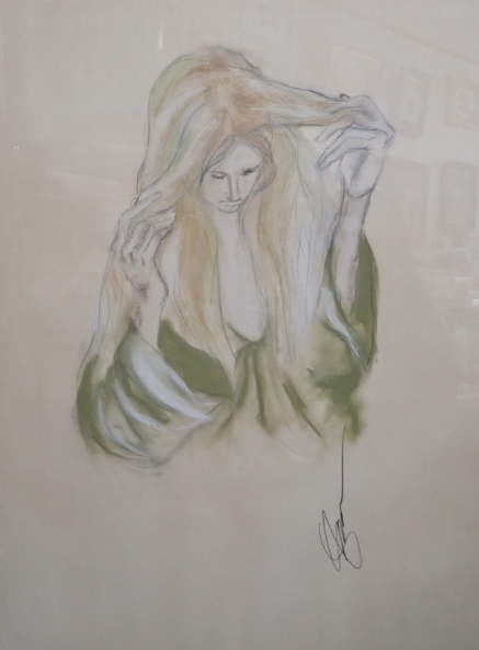 75x100、額93x118 全紙より大きく40号サイズの紙のデッサンである。知り合いがいたオークションで引き取った。「雰囲気はあるんですけどねえ。」とは言ったが作家不詳。達者なアマチュアだろう。一気呵成に描いた。線に迷いがない。上半身だけなのはどうかな、手と顔のバランスが悪いなどとは思わせない迫力がある。彩色も雰囲気なのだ。これも勉強のために観ている。サインも良いが読めない。 |