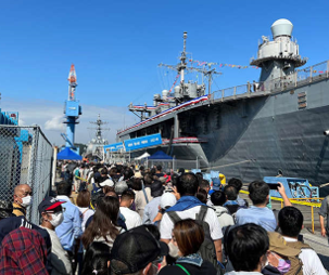 に並ぶ人たち。基地に模擬店も出て家族連れやマニアでにぎわう。 |