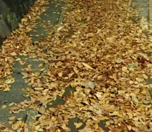 自宅近くの歩道。秋の終りを告げる落ち葉の歩道が出来ていた。昨夜の強風で崖上方の欅の葉がすっかり落ち歩道を埋めていた。歩くとさくさくっと音がして心地良い。昨夜の雨の後で生温かい空気が支配するが冬の訪れを告げる。明日から師走だ。 |