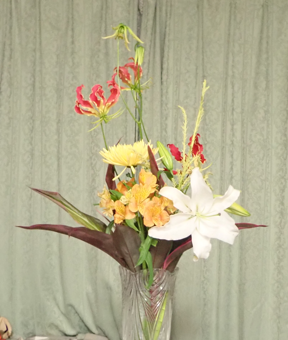 このスタンド(8脚)から8種頂いたカサブランカ・アルストロメリア・マム・ゴロリオサ・ドラセナ・ユニファー?の6種とスナップ・カスミソウ(別瓶) |
