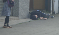 大滝町の入口付近で寝込んでいる。隣に女性が信号待ちしているが近づかない。今日は近所のヴェルニー公園でビール祭りをやり、三笠公園も賑わい、倒れるほど飲んだのかも知れない。4時くらいで明るい。警官もきていない。半世紀前は普通に見られたが、コロナ明けで一気に民衆の気持ちが緩んだのかな。昨日のOでの時間制限と本質的には同じかも知れない。 |