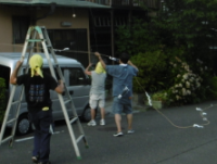3-4人で脚立を使い3-4mの高さに御幣を括った縄を張っていく。結構大変な作業を毎年受け継いで伝承していく。1,000枚の御幣で住民に祭の始まりを知らせる。 |