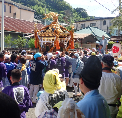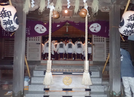 午後6時の御仮屋 子供神輿が神社に出発し、御仮屋では樽神輿はじめ片付け終わり一休み、肩に安堵と疲れがどっと残り少し虚脱感が漂う。 毎年の繰り返しで、同じようで少しずつ変化している。5年前から平均年齢が5歳上がり引退をする人がいる一方、新しい人が入らない。 非生産年齢の連中でこのまま朽ちるのだろうか。それとも、私がくたばれば新しい新芽が光を浴びて成長してくるのだろうか。 繰り返しを信じて今年は店仕舞い。この上の提灯はこれが見納めになる。 |