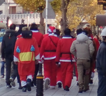 Xmasサンタの役目を終えて 20181225午後3時 偶々、見かけたサンタの集団。何となく日本人に見えた。この時期如何にもサンタみたいな白い髭の老人で西洋風の容貌の顔で、かつ背が高い多少でっぷりした人が、イオン(以前のダイエー)がテナントのショッパーズにいて、子供たちと記念撮影をしていた。今年も何人かそれらしい人を見たが一人で役目を終えた帰り道ですれ違ったが、この集団行動は何なのだろう。役所の方から歩いてきて安浦の方へ歩いて行った。日時から判断してタイトルを付けたが定かではない。街はXmasから正月モードに変貌していた。松飾りの屋台が売り始めていた。でも今日がXmasなんだけどね。 |