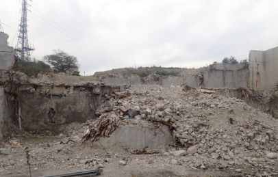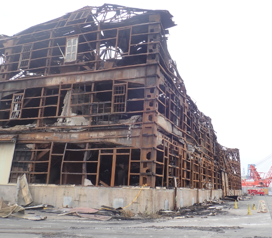 火事のその後 4か月前の全国的なニュースになった現場。火事の原因は漏電ということになったようだが、今も匂いがキツイ。2万平米が更地になりつつあるが、残骸が残っている。いつまでかかるかは知らないが、一見更地に見えてまだまだな気がする。古い建物の沁みついた匂いというか歴史は沁みついている。鉄筋だけの骨組みと思っていたが結構得体の知れない(と門外漢は思う)物体が転がっている。素人目にも処分の難しいのが残っている。 |