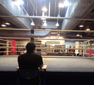 キックボクシング20181216 初めてリングを観た。手前がジャッジで奥に勝利者トロフィーが置いてある。試合前の緊張感は無いが、観戦者は30人程だろうか。あとは試合のセコンドだったりして立っている。リング前が5,000円、2列目が4,000円、その後ろが自由席で3,000円だ。空いてたので2列目で観戦した。デビュー戦とはいえ迫力は「半端ない。」という流行語が当てはまる。写真OKということだったが、始まったらそんな余裕はない。夢中で声援したし、倒せと一縷の望みを託しながら応援した。Aさんの試合。 |