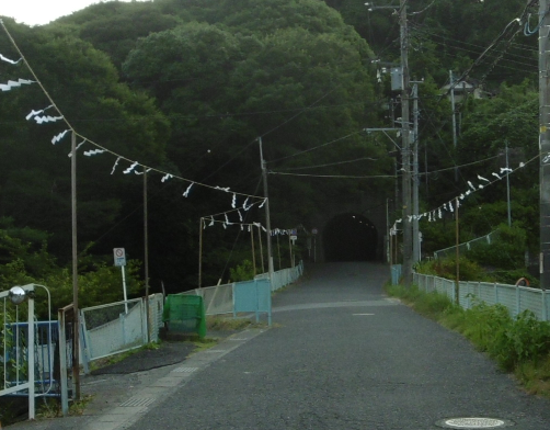 総勢16人位で左右の市道の両脇を御幣を注連縄に括り付けていく。左の写真の奥が水道トンネルに続く。