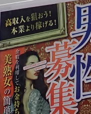 自動販売機のポスター 「男性募集」「美熟女の簡単なサポート」と書かれ、募集条件は70歳位までとある。内容は、「食事・ドライブ・恋の悩み相談から日曜大工・介護」など多岐にわたる。我々でもできそうだが、ポスターの写真が意味深で怖い。美熟女なんて縁がないし、恋の悩みはとっくに卒業しているし、相談に乗れる程の経験もない。 |