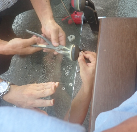 京急バス停の遮蔽板の応急処置 下に映っているのは私の服と右下は手になる。二人の関係者といっても、専門家ではなく制服組だ。 アクリルの遮蔽板の下の留め金が外れて、グラグラしていたようだ。座って寄りかかたら道路側に少し倒れ込む。 何とかありあわせのネジを当てはめて道路側に出っ張りを持っていき歩道側は安全なように留めていた。座りながら撮った。 半年前まではカメラのシャッターを切るなんて考えもしなかったが、最近はすぐ撮る癖がついてきた。 その時カメラマンは見ていて何も手助けをしないのか。この場合は京急マンではないので仕方ない。 |