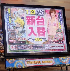 新台入替 ようやく、アップできた。右が一月前。「新入り、台(代)替わり」と読めると思いながらみていた。 やっと「新台入替」と間違えようがないコピーになったので掲載することにした。およそ1か月、 誰かが何かを言ったのか全く関わっていないので判然としないが、日本語としては左が正しいし判り易いが、 右の方は新人が入ったと思いそそられる気がしないでもない。写真もあるし。 |