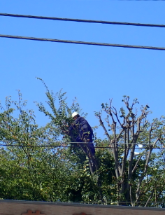高所恐怖症 以前、鉄道の軌陸車を取り上げたが、電柱の電線工事も最近は専用車が多い。電柱を登らずに作業車で仕事する。 これなら高所恐怖症の私も乗れそうだ。隣で同じ高さ位の場所の樹の剪定作業をしていた。丁度向かい合わせだが、安全面ではかなり違う。 左は空師というらしいが、昔ながらの方法しか無いのだろう。恐くてとても出来ない。 |