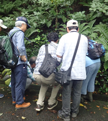 昆虫と花の撮り歩き 観音崎公園を仲間と撮り歩いた。途中、気になる虫や章句物があると先生を囲んで確認する。メモを取らない限り昆虫や草花の名前は忘れるので書く。 若いころは覚えている自信はあったが今は5分も持たない。この写真の時には私はすでに知っている昆虫なので他の方に席を譲った。 そこで写真に収めた。唯一の一枚になる。蚊がすぐに寄ってくるので油断がならないが夢中で聞いたりメモしたりすると、 すぐに痒くなる。スプレー効果はあるのか定かではない。皆さん長袖シャツを着ている。半ズボンなどあり得ないと思うが山道を行き交うヒトには時々いる。 |
