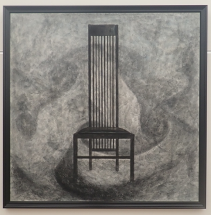 米倉正美『調』2018第五回改組日展 2009年に同じ題で出品したとき強い印象があった。その後、椅子をテーマにしてもタイトルは異なった。。今回は何か心境に変化があったのだろうか。中央に置かれているように観えるが、椅子の背もたれの珊一本位左に寄っている。椅子の足も少し違う。濃淡と影を巧く使い分けて錯覚を起こさせている。以前はクラシック音楽が流れてきた。今回はヨーロッパの古城を思わせる背筋の伸びた軍楽隊が奏でるメロディが聴こえるというか、激情を感じてしまう。何か変状がこの10年であったのか。 |