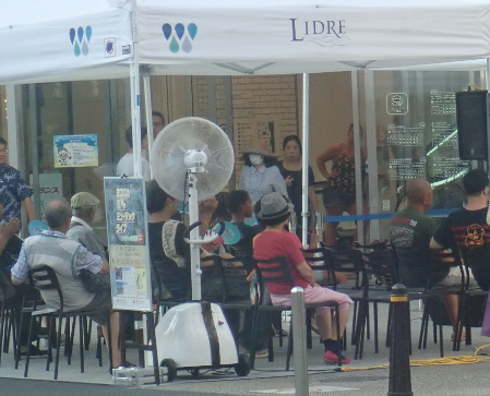 中央のリドリでは、毎週ミニライブが開催されている。まだ無名の歌手がパフォーマンスを披露している。この日も猛烈な暑さのなか、扇風機で暑い風を攪拌しているだけの気もするが、団扇より良い。私が知らないだけかもしれないが無名と思っても特定のファンや支援者はいるのだと思う。日本版ゴッドタレントだ。審査員とTVは無い。 |