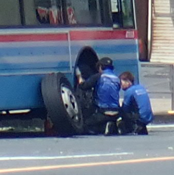台風の後の朝、JR横須賀線が運休、横横道路は通行止めらしいという。16号の上り線が10㎞を2時間以上かかるという。そんなとき、よりによって池ノ谷との上り停留所の前でバスの右前輪に異常があったようで、係員が交換をしていた。交代のバスが来たり、なんやかやと大変な様子だった。反対側の下り停留所で思わず写真を撮った。追い越し車線に車のいない時を狙うも中々込み合っていて空間ができない。下り線のバスが結局来ないので、ここから歩いて逸見迄いった。 |