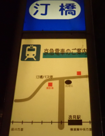 バス停/汀橋の停留所時刻表案内に近くの京急線「逸見駅」までの地図が夜でも判読できるように掲示されている。バス停名称に「逸見」の文字は無い。問い合わせが多く、それほど頻繁に来ないので、不便なので親切に貼り出したのだろう。地元だと感じないが観光客が多くなり、インバウンドへの対応としては当然かもしれない。 |