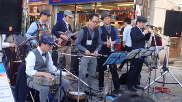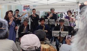 中央近辺の4か所でフリーライブを2日間開催していた。写真は、上が三笠通り会場(2日)、下がリドレ会場(3日)の様子だ、観客は3・40人位か。「横須賀トモダチジャズ2019」の一環だ。足を止めて聴く人も多く椅子は満席。曲は無論ジャズが多い。一方みんなが知っている曲も演奏され誰でも楽しめるように、気を使っているのが感じられる。本格的なプロ・グループもいる。このステージはセミプロのグループも多いような感じがした。カフェで聴くのにライブもいいもんだ。ジャズの世界を知らないが芸術劇場の方は有名なプロなのだろう。 |
