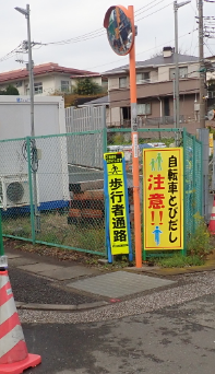 以前は川だった。そこを整備して歩道にしたので、「注意」の看板に責任者が市下水道局になっている。手前左のラーメン屋の休憩場所にもなっているが、喫煙所でもある。左の立て看板を右上に拡大した。バイク・自転車は降りなさいということは住民の総意なんだろう。車を持っている人は不便だと思うが、川があると思えばOKか。 |