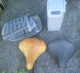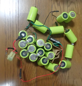 | 下左は電動自転車の解体作業で最後に残ったサドル・カゴ・バッテリィだ。サドルの上カバーを剥がしたらクッションに名前やらサイン・記号の様なものが書かれていた。元々アイクル品(市のリサイクル販売)なので前所有者が盗難時の確認用なのかもしれない。バッテリィは業者処分だが、分解したら右のように単一の電池である。20個が並列と直列に並んでいるだけだ。更に分解して電池として処分する。機械に弱いが少し勉強した。 2019.12.01 |