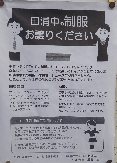 毎年、9月に防災訓練がある。谷戸の掲示板にも掲載するが、身近な情報だ。そして地元の公立中学の制服を譲ってくださいという案内はとても重要だ。捨てるくらいなら少々傷んでいてもOKで、成長過程の子供には金が掛からなくてかつ成長に合わせて着まわせる。一石三鳥にもなる。制服が必要かの議論は少し置いておくが、是非譲っていただきたい。 |