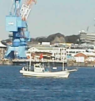 久しぶりにベルニー公園で一休み。バスを待つ20分だけ湾岸を眺めた。見慣れない小型船だ。背景は米軍基地で荷下ろしのクレーンが見える。船が向かう先には軍港巡りの観光船乗り場である。漁船でもないし曳航船でもない。民間の釣船が入る港でもない。岸壁に着くまでは見届けられないので後ろ髪を控える思いで写真だけ撮った。(いつものカメラが電池切れで、ガラ携の古い型はこの程度の画素)船名を確認中 |
