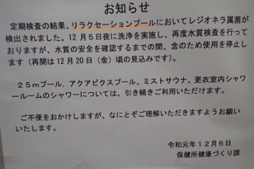 いつも水中ウオーキングするプールで左記のお知らせ。利用中毎日定期的に検査している。市営でもあり厳格で或。被害者が出たわけではない。我々の日常に普通にいる菌類で39℃を好むという。プールは30℃なので、泳いだりアクアビックの後に温もって帰る方が多い。だから、温度を下げる訳にいかない。だから、汗をシャワーで落としてから入るよう再三注意している。 |