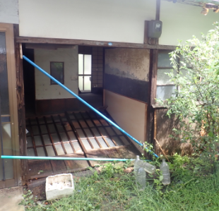 台風が去ったあと、近所を見廻った。もう20年以上も誰も住んでいない。10年前までは書庫だとか物置代わりに借りていたが、返却した。今風の一畳くらいの扉でなく、両開きの引き戸で上り口が土間である。そこに見事なくらいに2枚の引き戸が倒れていた。みると右側の上のガラスが砕けていた。土間の右は土壁になっている。上り口は障子戸だ。100年前には普通にあった建屋なのだろう。この右壁の隣に寝起きしていた。懐かしさが込み上げ死ぬまで残しておいて欲しい。地主と持ち主が別で多少複雑な物件になっている。 |