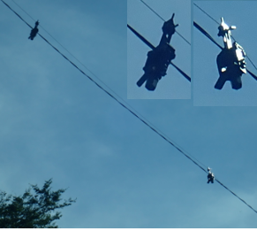 16号昇り線に並行した電線に瞬間?思った。動かないし写真に撮って引き延ばしたらそれらしい鳥型が2体バランス良く付いていた。何かの対策で東電がつけたのだろう。目的・効果・費用など確認したくなった。とりあえず写真に収め後日関係ありそうな人に聞いてみる。田浦ではないので、知り合いがいる町内でない。 |