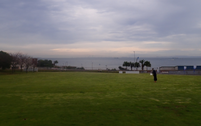 横須賀美術館の前庭から浦賀水道を望む。東京湾をはさんで千葉県が微かに見える生憎の雨上がりで霞み、前庭には人影が映り込んでどこかで観たような絵画空間を構成していた。心安らぎ過ぎゆく船を眺めゆったりした時間を過ごした。 |