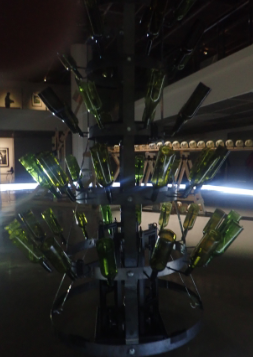 期待が大きすぎたので、評価は低い。このインスタレーションはパフォーマンスの一部である。ホラ貝の音と共に5段飾りのワイン瓶が揺れ高音を奏でる。瓶の底が不規則に割られたり切られて音色が異なる。中の電球が点滅するようになっており音楽と連動して、他の機械の作動に共鳴する。X'masが近いし、ツリーに見立てられたので掲載した。他にも写真OKなので撮ったが割愛する。エレベーターガールからはまだ発展途上のような消化不良だと感じた。今後に期待したい。面白いアイデアだとは感じる。 |