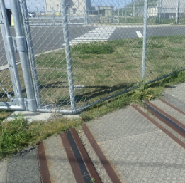 | フジケンの鉄道跡 左はお馴染みのダイヤモンドクロス。向かい合うように2箇所残る。その一方の先に左の途切れた線路跡が残る。2年前までは岸壁まで往時の形を残していたが、海事の新しい建物の前に切断された。戦前が半分消えた。 |