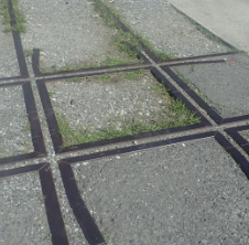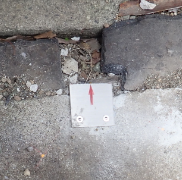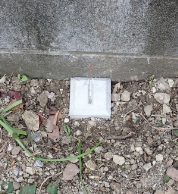 | 2020年3月27日に確認した境界標:左は2cm位隣家側に打ち直した。その隣は1cm位自宅側に打った。中央は50cmの深さに埋込んだコンクリ性の標識。 改めて隣家との境界線を認識した。5種類の杭を使い分けてる。 | ||