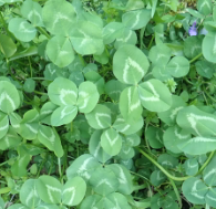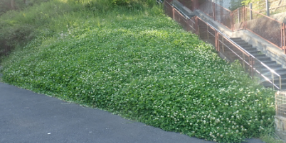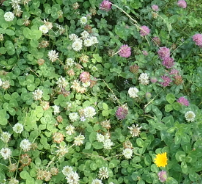 盛福寺谷戸の突き当たりにシロツメクサの群生値がある。場所により四つ葉が多い。また、左のように二つ葉が10本以上群生している場所があった。結構虫に食われているが、人工的に加工してない。葉の付き方・模様などからの素人判定。 |