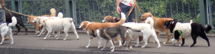 | ペットの散歩 時折昼間見かける。男女がそれぞれ10頭くらい腰紐で散歩させている。女性の方が小型犬が多く、男性はご覧の中型犬以上だ。聞くと仕事らしい。この国際村の家で飼われている犬の散歩を引き受けるという。 |