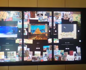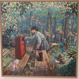 | 第72回児童生徒作品展(横須賀美術館)に展示されている幼稚園から小中高生の作品で様々な立体作品もある。下は幼稚園の作品で相対的に目の位置が顔の上部にあり、成長するに従い見たままの顔の中程にくる。その変化が判る数少ない作品展で毎年楽しみにしている。 | 《お返事くださいな》100号、文部科学大臣賞受賞作品 総合高校の生徒作品で幼児から成長した完成形だ。無論これ以外にも素晴らしい作品があるなかで一番目についたのでここに紹介する。場所はどこだろう。誰に差し出したのか。あなたにとって大事な人?など考えると楽しい。 |