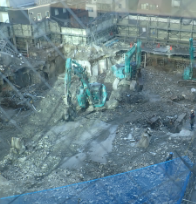 五輪後も続く、建設ラッシュ 美術館に隣接した土地に建っていたビルの取り壊しが進んでいる。外部からは見えない場所。ここは美術館の展望フロア。あと数年は先になるだろう。外部とはいえない土地なのでブリジストンと関係しているのかも知れない。そうでなくば展望フロアなどにはしないだろうと考えるがどうだろう。 |
