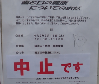 | 新型コロナウイルスの余波 2020年2月20日 自治会の掲示板の募集案内に「中止」の貼紙。歯と口の健康についてだから良さそうと思うが、これ以外にも「自殺予防キャンペーン」が中止になった。昨日保健所からゲートキーパーに電話があった。京急駅前で開催予定だったが、京急がイベント自粛らしい。又下記に案内した「田浦梅林まつり」のイベントが中止になった。梅や水仙を見るのは一年中OKだが、イベントがないと寂しい。何も無い唯の丘で売店はない。これで良いのかと思うも、座して待つ身はじれったい。 |