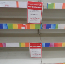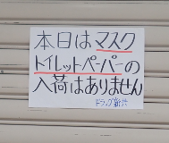 | 新型コロナウイルス余波2020年3月15日 近所の薬局はじめ量販店などマスク・トイレットペーパー・ウエットティッシュ・業務用洗剤の棚が空。そして、シャッターにも貼紙がしてある。ホームズにはトイレットペーパーは潤沢にあったが、普段見かけないメーカー品の山。バイヤーの努力の賜だし、メーカーに有難う、助かります。のお礼の言葉を贈りたい。 |
