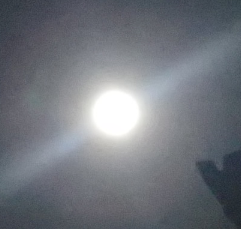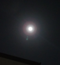 | スーパームーン2020年4月7日23時35分 自宅2階ベランダより 4月8日11時35分(日本時間)、日本では昼間なのでこの瞬間を見ることはできないが、月は満月を迎える。その8時間半ほど前の4月8日3時9分に、月は今年2020年で最も地球に近づく。つまり、今日4月7日の夜から翌8日にかけて空に昇る月は「今年一番地球に近い満月」、いわゆるスーパームーンと言う。あと3時間半は起きていられないので寝る前にシャッターを切った。 |