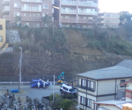 | 崖の崩落 2020年2月5日 逗子・池子 生活道路の石垣上を開発しマンションを造成した。市歩道の側面石積みの上は民有地。県/市の要請を無視していたか判然としない。しかしそこが13mにわたり68㌧の瓦礫が崩落し女子高生の命を奪った。まだ左右には崩落予備軍の土地がある。事故から8時間、メディアの数が半端ない。 |