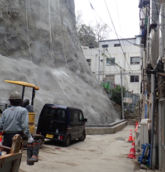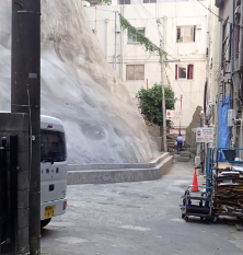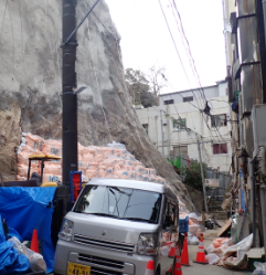 崖崩れのその後 半年前の台風被害の崖崩落がようやく対策調査が終わり作業が開始され、半分くらい上部がセメントを吹き付けられた。下部は別の対策になるのだろう。垂直に切り立った崖で、横須賀の全域にわたって存在する。地中アンカーを埋め込みセメントを吹き付け崩落の上部はなんとか対応できた。次の台風までにはなんとか全て終わりそうではある。中央の中心部であり、人目に付きにくいがビル倒壊になりかねない。大丈夫と思っていると大惨事になる。 |