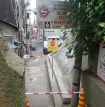 崖崩れで通行禁止が解除ではなく元々通行禁止です。 右上に看板があるように元々通行禁止の私有地でした。葉陰で看板が見えないこともあり今までは慣習的に歩行者は通行していた。崖崩れを機にはっきりと禁止の立て看もあり、いつまた崩れるか判然としないし、(コンクリで防止策は打ったが)根本的には私有地なので異議を唱えるほどの事も無い。事故が起きたら所有者の怠慢を指摘される時代だ。2020年6月1日現在 |