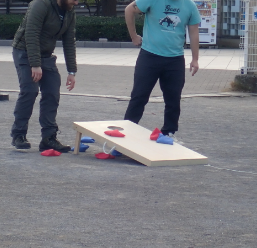 ヴェルニー公園の昼下がり 2020年2月1日 公園で隣接の米海軍関係者と思われるグループがゲームに興じていた。名前を知らないが、2人1組で4人が互いに5mほど離れた場所から相手陣地の斜めに置かれた板の上に青・赤のお手玉のような袋を投げて競っている。急いでいたので写真だけでゲームの名前とルールを聞かずに立ち去った。帰宅してネットで調べたが解っていない。 |