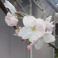 | お花見2020年4月2日 左は県立福祉大の正門前の通り、この正面右の通りの桜並木も満開で行交う人を楽しませてくれるのだが、人通りが少ない。右は自宅の御殿場桜が2分咲きになった。こちらはご近所の方が「きれいですね。」というだけで自分で楽しんでいる。 |